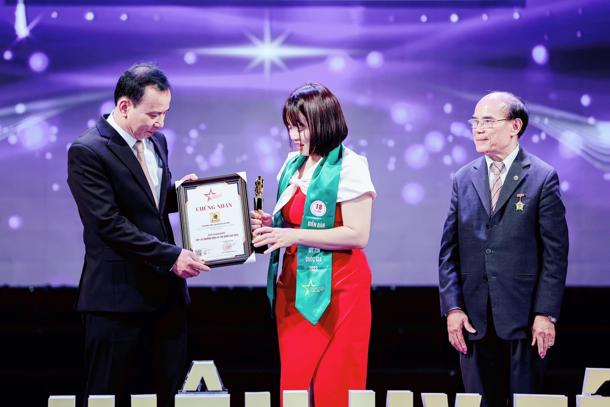 Ngày 16/12/2023 vừa qua tại nhà hát Quân Đội thủ đô Hà Nội chương trình Thương Hiệu Uy Tín Quốc Gia đã diễn ra thành công tốt đẹp, chương trình nằm trong khuôn khổ các hoạt động vinh danh, tôn vinh các thương hiệu vững mạnh hoạt động uy tín và có chỗ đứng trên thị trường trong nước và khu vực do trung tâm công nghệ chống hàng giả, Hội nhà báo Việt Nam phối hợp tổ chức. Bà Nguyễn Thị Nhung Giám Đốc đại biểu đại diện, người sáng lập thương hiệu An Hội An Cà Phê đã tham dự chương trình với tư cách khách mời danh dự của sự kiện . Hệ thống An Hội An Cà Phê được vinh danh trong top 10 đơn vị có Thương Hiệu Uy Tín Quốc Gia cùng với hơn 200 đơn vị thương hiệu khác.